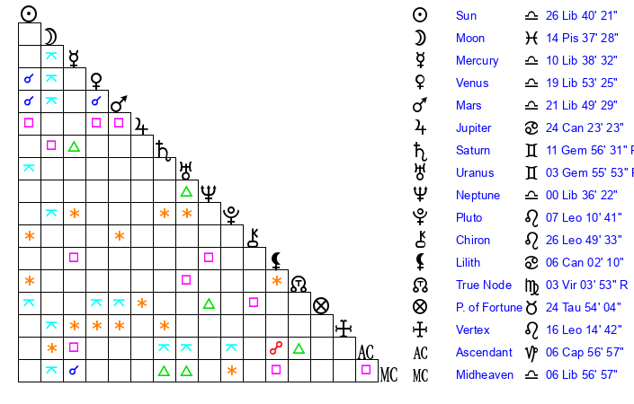 | Sun | 26 Libra 40 | 27 Libra 33 | 20 Capricorn 37 |