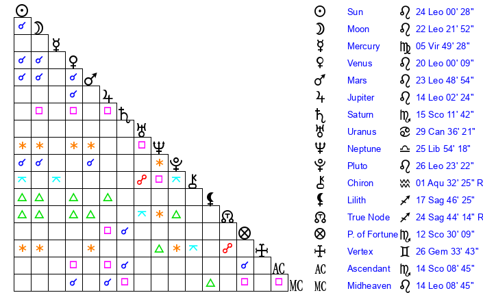 | Sun | 24 Leo 0 | 25 Leo 2 | 2 Scorpio 30 |