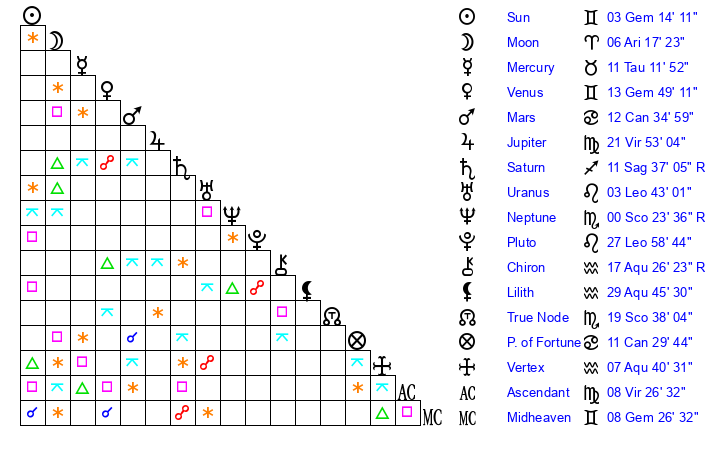 | Sun | 3 Gemini 14 | 3 Gemini 46 | 8 Leo 12 |