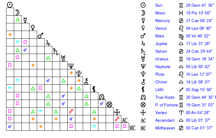 | Moon | 19 Pisces 3 | 9 Taurus 9 | 12 Aquarius 16 |