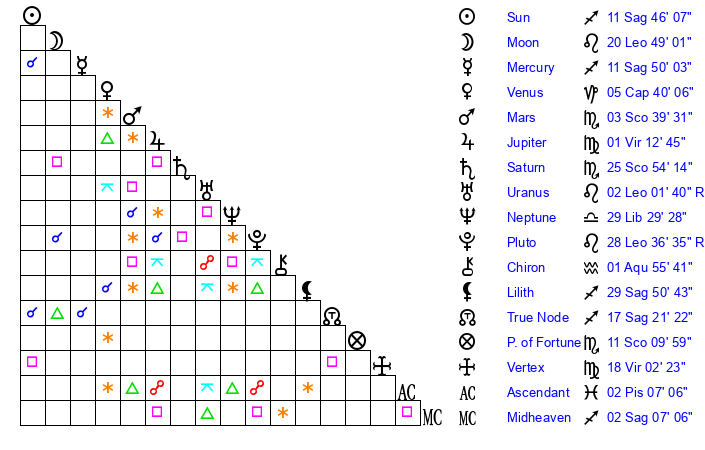 | Sun | 11 Sagittarius 46 | 12 Sagittarius 48 | 22 Aquarius 58 |