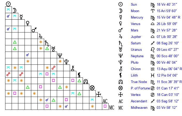 | Sun | 18 Virgo 40 | 19 Virgo 12 | 26 Scorpio 6 |