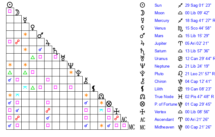 | Moon | 0 Libra 5 | 18 Capricorn 21 | 26 Gemini 42 |