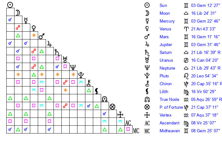 | Moon | 16 Libra 19 | 29 Aries 41 | 14 Gemini 13 |