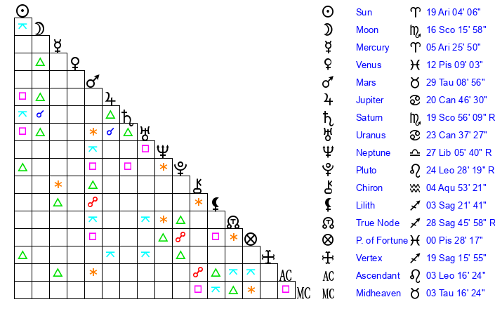 | Sun | 19 Aries 4 | 20 Aries 5 | 26 Gemini 40 |