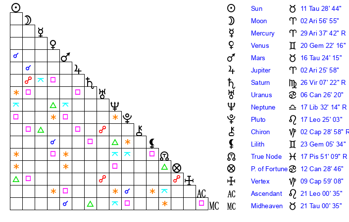 | Jupiter | 2 Aries 19 | 21 Gemini 43 | 13 Aries 24 |