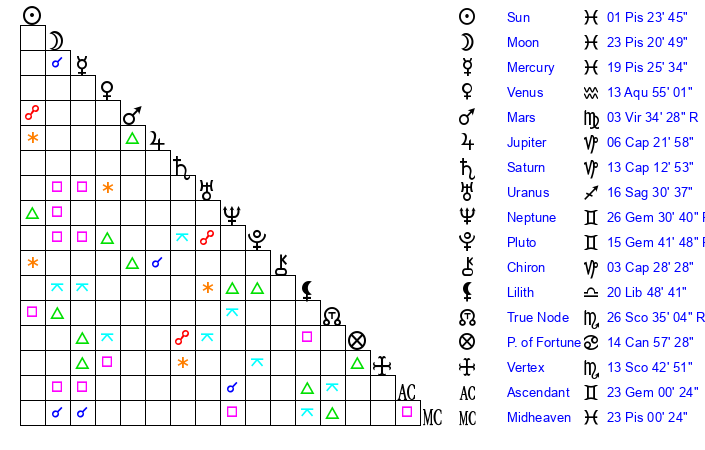| Saturn | 13 Capricorn 42 | 19 Pisces 37 | 14 Capricorn 28 |