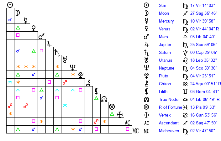 | Sun | 17 Virgo 14 | 18 Virgo 14 | 22 Scorpio 35 |