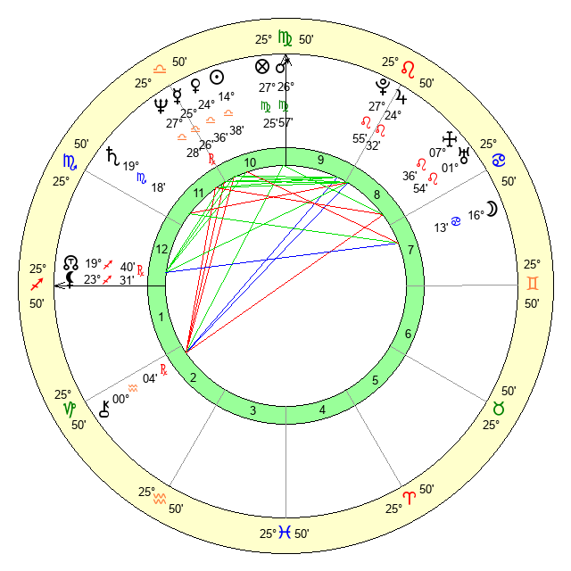 | Mars | 26 Virgo 57 | 11 Scorpio 9 | 12 Scorpio 7 |