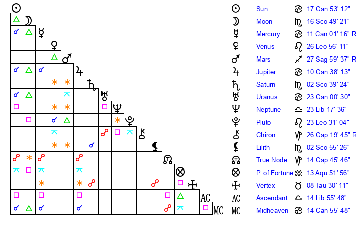 | Moon | 16 Scorpio 50 | 16 Capricorn 59 | 29 Gemini 11 |
