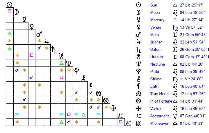 | Sun | 27 Libra 25 | 28 Libra 33 | 20 Capricorn 22 |
