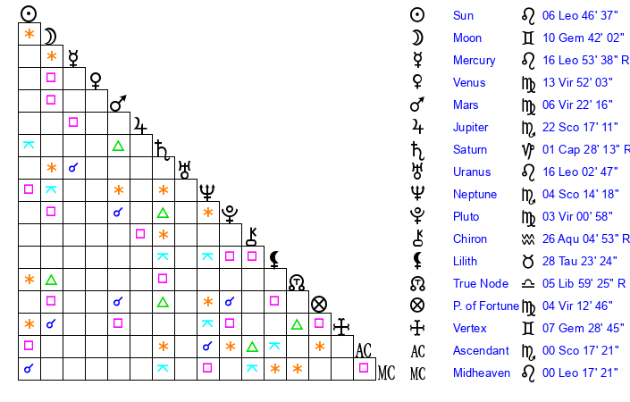 | Sun | 6 Leo 46 | 7 Leo 47 | 10 Libra 43 |