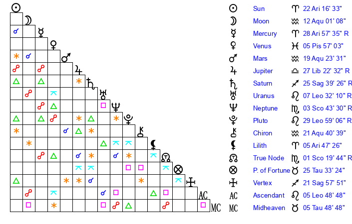 | Sun | 22 Aries 16 | 23 Aries 2 | 26 Gemini 56 |