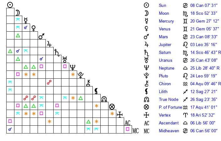 | Moon | 18 Scorpio 56 | 15 Virgo 36 | 6 Gemini 54 |