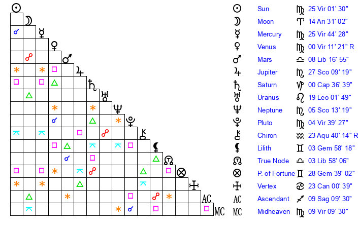 | Sun | 25 Virgo 1 | 26 Virgo 2 | 0 Sagittarius 39 |
