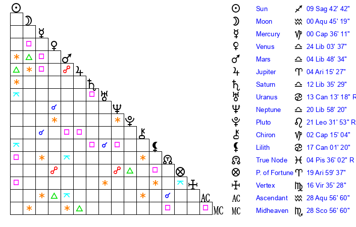 | Neptune | 20 Libra 58 | 29 Pisces 22 | 21 Libra 34 |