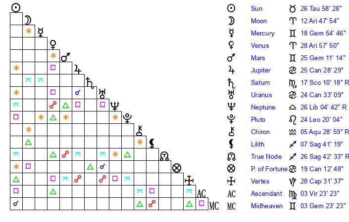 | Sun | 26 Taurus 58 | 28 Taurus 0 | 3 Leo 52 |