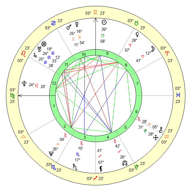 | Moon | 12 Aries 43 | 6 Aquarius 4 | 15 Scorpio 37 |