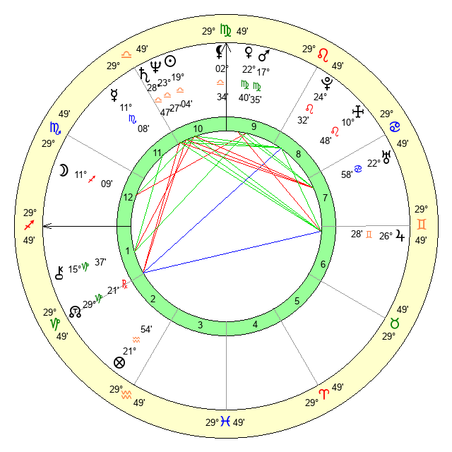 | Mars | 17 Virgo 36 | 13 Scorpio 55 | 1 Scorpio 57 |