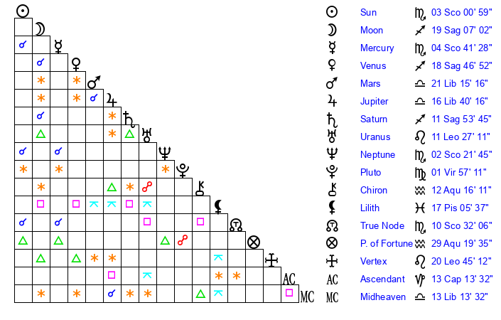 | Neptune | 2 Scorpio 21 | 29 Pisces 53 | 4 Scorpio 27 |