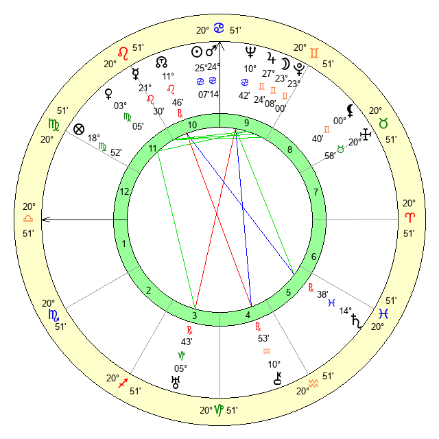 | Sun | 25 Cancer 8 | 26 Cancer 19 | 21 Scorpio 26 |