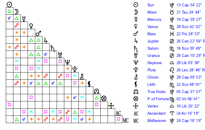 | Moon | 21 Taurus 37 | 14 Pisces 47 | 13 Sagittarius 31 |