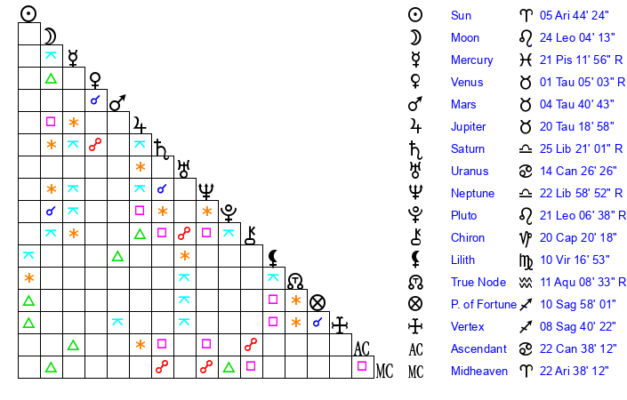 | Neptune | 22 Libra 58 | 29 Pisces 51 | 21 Libra 17 |