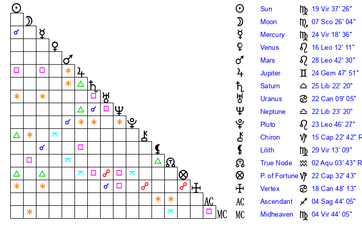 | Mercury | 24 Virgo 19 | 19 Virgo 31 | 14 Scorpio 35 |