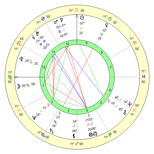 | Moon | 21 Virgo 6 | 14 Cancer 10 | 1 Aries 5 |