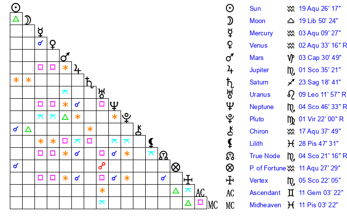 | Moon | 19 Libra 38 | 3 Cancer 23 | 29 Pisces 44 |