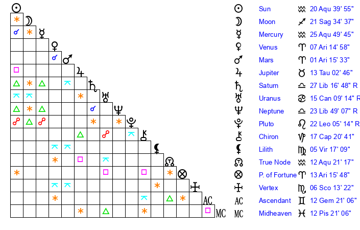 | Sun | 20 Aquarius 40 | 21 Aquarius 12 | 2 Taurus 15 |