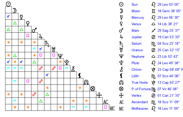 | Mercury | 29 Leo 57 | 11 Leo 50 | 2 Scorpio 28 |