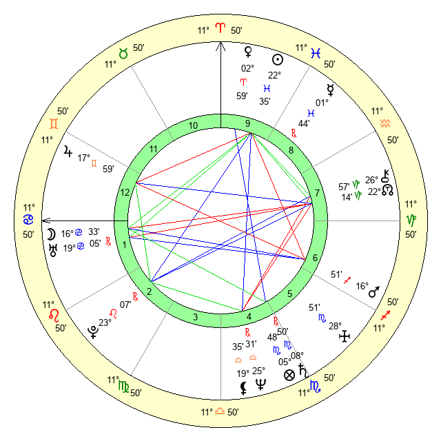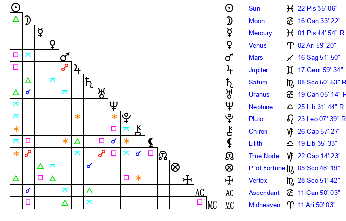 | Moon | 16 Cancer 34 | 16 Virgo 46 | 8 Aquarius 42 |
