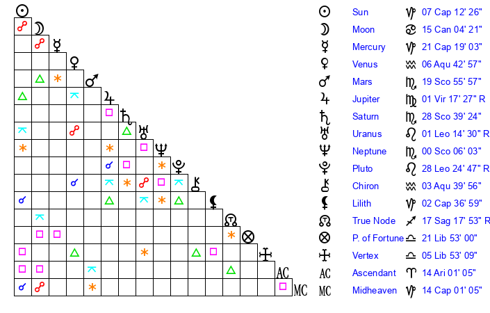 | Mercury | 21 Capricorn 19 | 17 Sagittarius 0 | 24 Aquarius 26 |