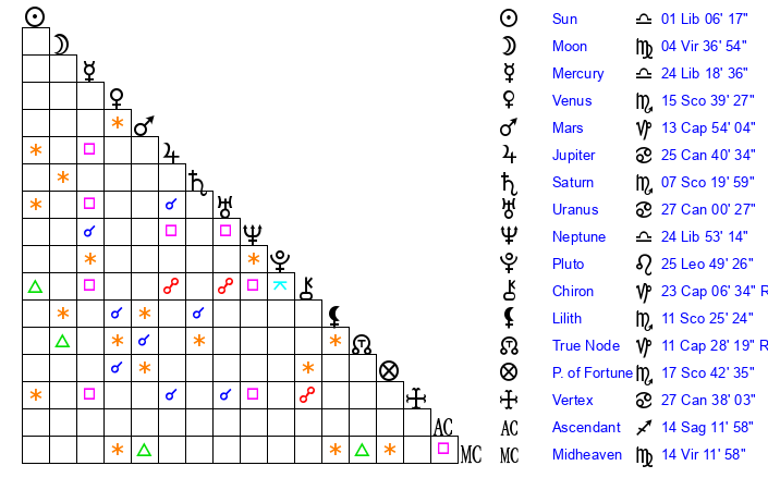 | Mercury | 24 Libra 18 | 10 Libra 54 | 0 Sagittarius 38 |