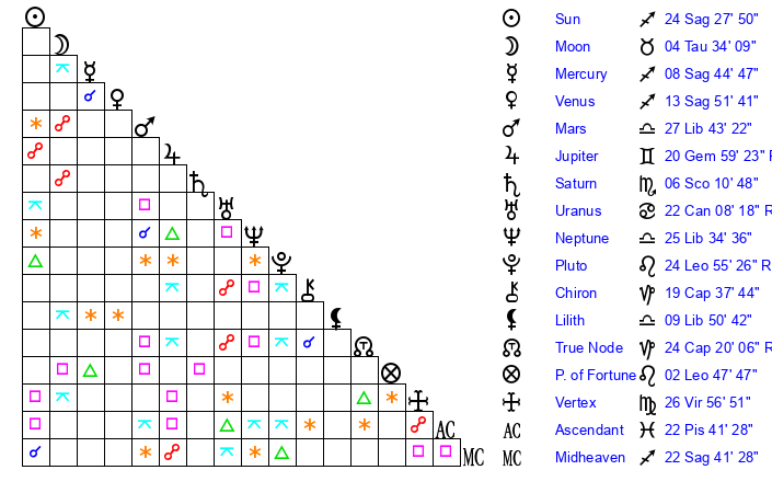 | Moon | 4 Taurus 42 | 18 Scorpio 16 | 15 Sagittarius 41 |