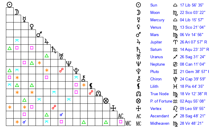 | Moon | 22 Scorpio 4 | 21 Gemini 40 | 17 Aries 35 |