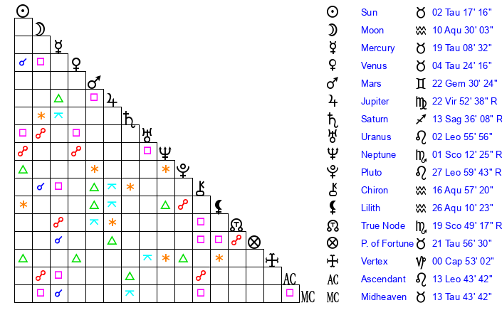 | Venus | 4 Taurus 24 | 26 Pisces 22 | 27 Cancer 53 |