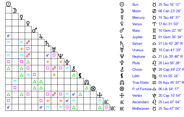 | Sun | 25 Taurus 16 | 25 Taurus 50 | 4 Leo 6 |