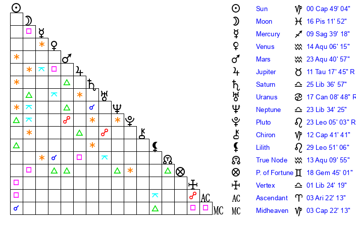 | Sun | 0 Capricorn 49 | 1 Capricorn 6 | 14 Pisces 50 |