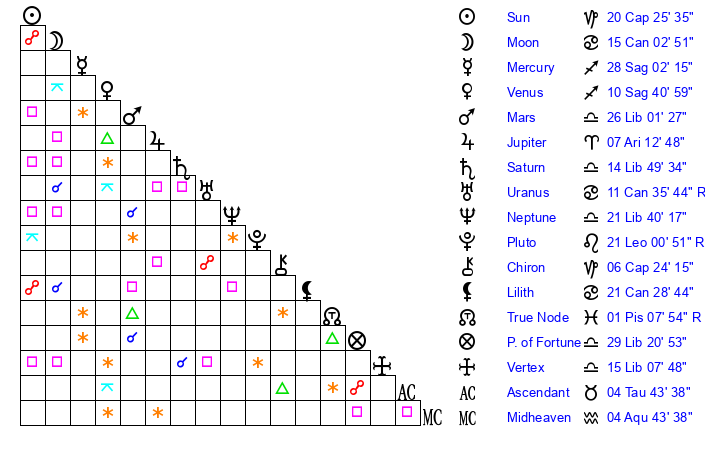 | Mars | 26 Libra 1 | 27 Cancer 58 | 18 Scorpio 26 |