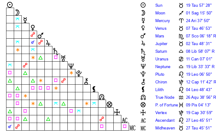 | Sun | 19 Taurus 57 | 20 Taurus 17 | 29 Cancer 47 |