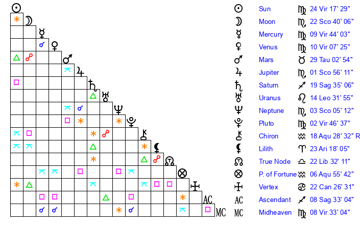 | Sun | 24 Virgo 17 | 25 Virgo 3 | 0 Sagittarius 54 |