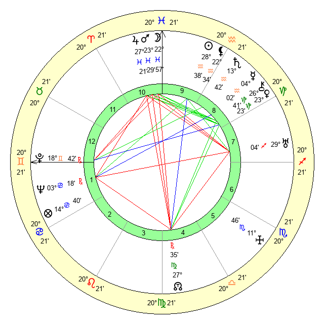 | Sun | 28 Aquarius 38 | 0 Pisces 17 | 26 Gemini 59 |