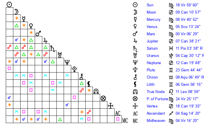 | Sun | 19 Virgo 0 | 20 Virgo 11 | 18 Capricorn 18 |
