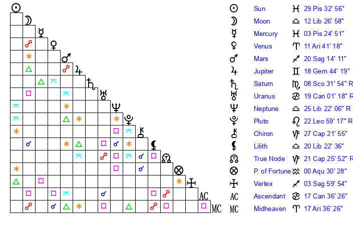 | Moon | 12 Libra 22 | 10 Sagittarius 10 | 18 Taurus 22 |