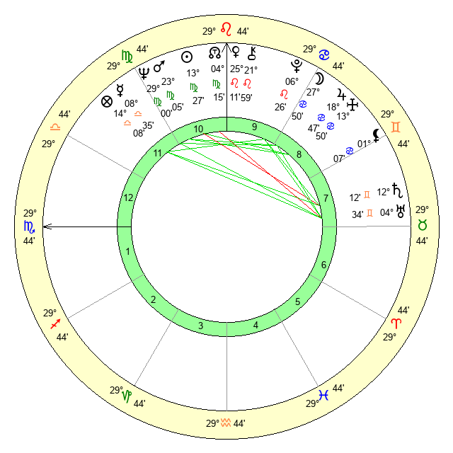 | Mars | 23 Virgo 6 | 1 Cancer 8 | 17 Scorpio 32 |