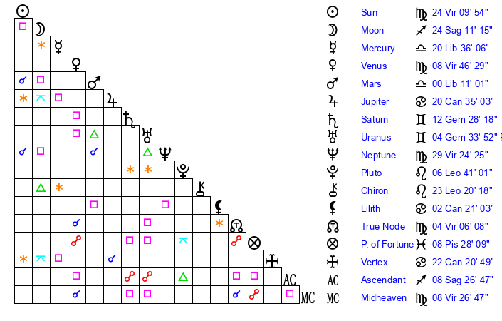| Sun | 24 Virgo 10 | 25 Virgo 3 | 17 Sagittarius 0 |