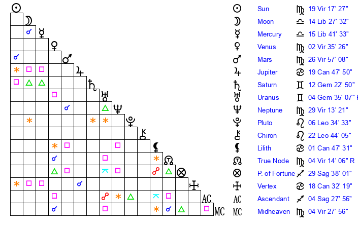 | Sun | 19 Virgo 17 | 20 Virgo 11 | 11 Sagittarius 55 |