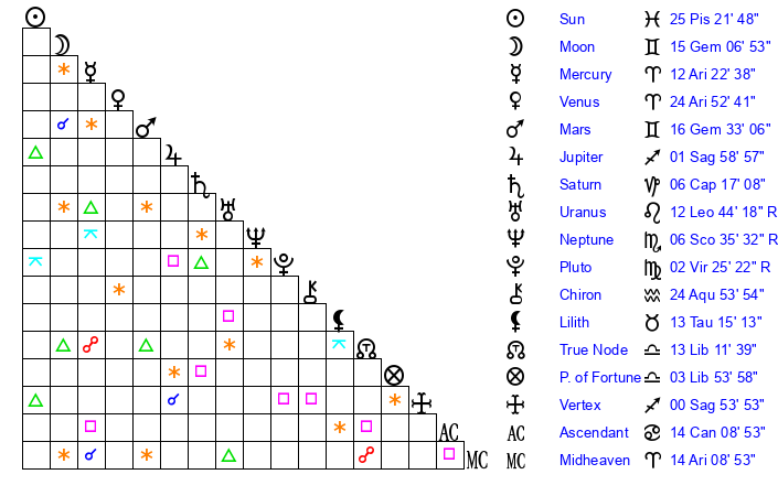 | Venus | 24 Aries 53 | 6 Aries 30 | 12 Cancer 25 |